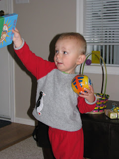 I'm a little late with this post, but these pictures are too cute not to share! Easter morning was a lot of fun. Grady's eyes lit up when he saw his Easter basket. We helped him find the first few eggs and then he got the hang of it ... he really loved eating the Smarties out of the eggs!